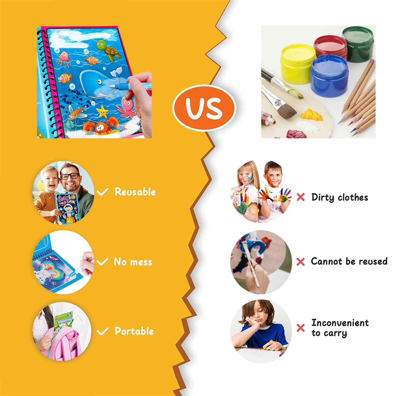 Each page is reusable and made with non-toxic, child-safe material, making it ideal for kids aged 2 to 7 years. As the water dries, the colors disappear — allowing your little one to enjoy the experience over and over again. From alphabets to animals, numbers to shapes, your child will be learning while they play!